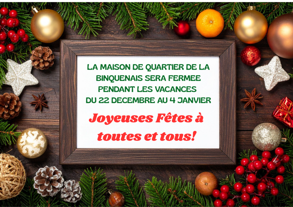 La Maison de Quartier de la Binquenais sera fermée pendant les vacances scolaires, du 22 décembre 2025 au 4 janvier 2026.