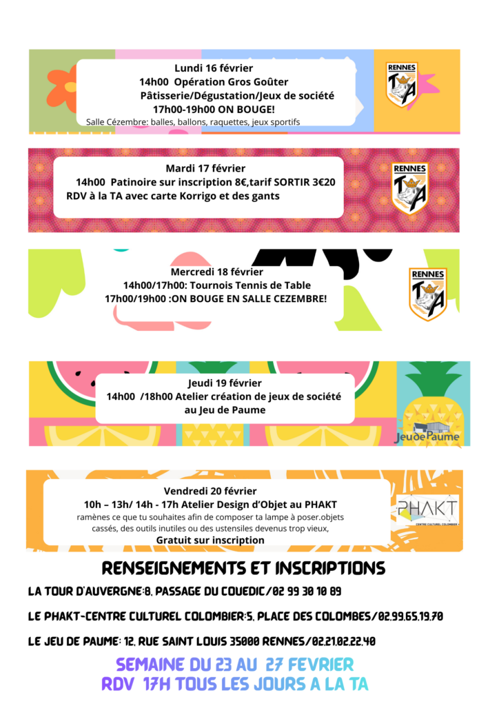 Pendant la première semaine des vacances de février, la TA Jeunesse propose un programme riche, ludique et dynamique à destination des 11–15 ans, avec des activités variées à vivre entre ami·e·s !