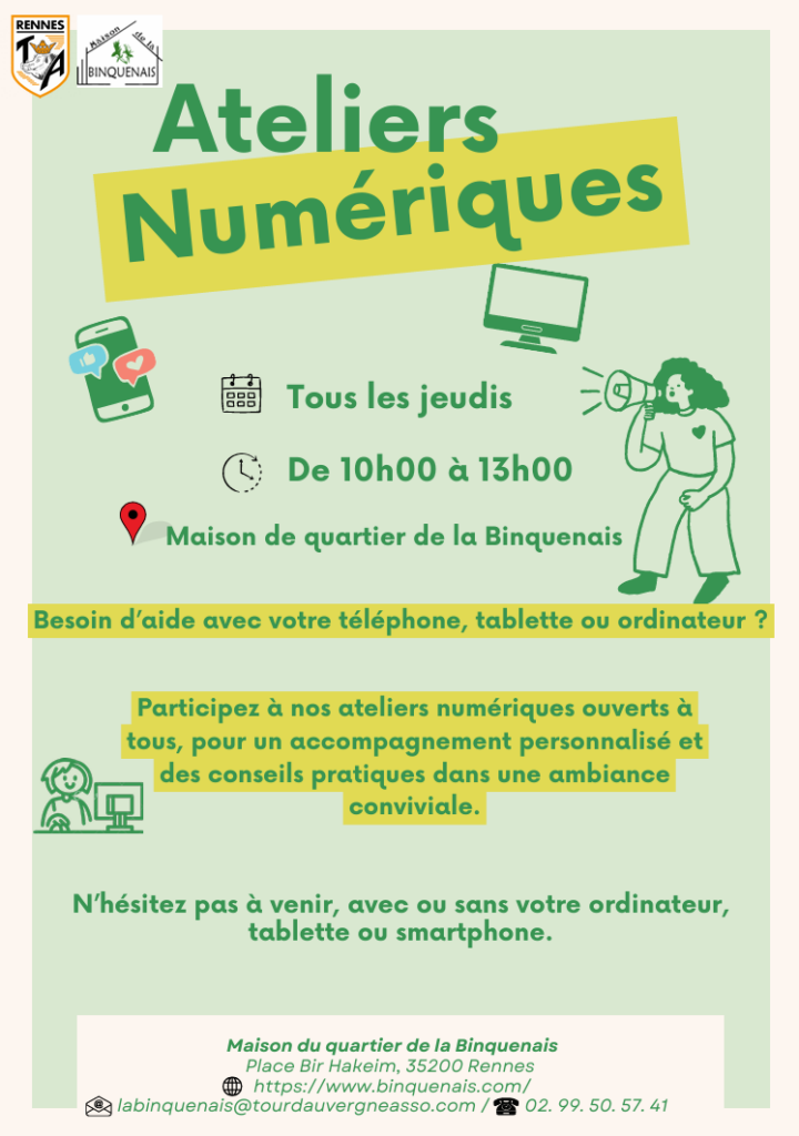 La Maison de quartier de la Binquenais vous propose des ateliers numériques ouverts à toutes et à tous, pour vous accompagner dans l’utilisation de votre téléphone, tablette ou ordinateur.