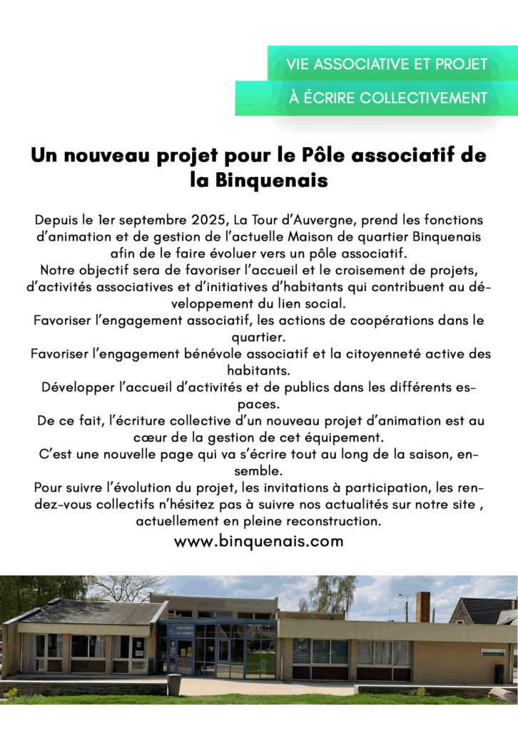 POLE ASSOCIATIF DE LA BINQUENAIS POLE ASSOCIATIF DE LA BINQUENAIS 30 septembre 2025 animation-mqb Commentaires 0 Commentaire Retrouvez la plaquette numérique du pôle associatif de la binquenais 2025/2026
