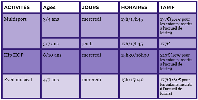Nous proposons aux enfants de l’accueil de loisirs du mercredi de pratiquer des activités en périphérie comme le piano, la flûte traversière, l’éveil musical, la guitare et les danses (Initiation et Modern Jazz).