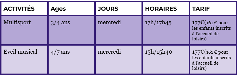 {Éveil musical (4–7 ans), Hip-hop (8–10 ans), Multisport (3–4 ans)}