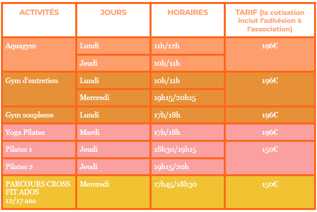 Pilates Pilates Renforcez votre corps et améliorez votre posture avec nos ateliers de Pilates ! Vous trouverez ci-dessous le tableau avec toutes les informations, y compris les horaires et les tarifs. Professeur : Jeudi de (18h30 à 19h15) ou (19h15 à 20h00) 150€ l’année
