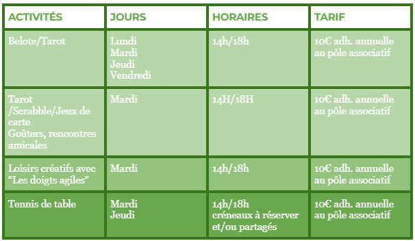 Tennis de table Tennis de table Mise à disposition de table Raquettes et balles non fournies Mardi de 14h à 18h Jeudi de 14h à 18h